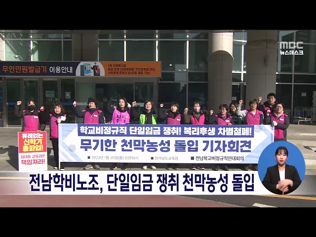 전남학교비정규직연대회의가 차별없는 합리적인 임금체계를 요구하며 무기한 천막농성에 들어갔습니다. 전남학비노조는 정규직 공무원의 기본급은 최대 5퍼센트 인상됐지만 비정규직에게 제시한 기본급 인상은 1.7퍼센트에 불과하다고 주장했습니다. 또 지난해 9월부터 시작한 임금교섭이 방향조차 찾지 못하고 있어 새학기...