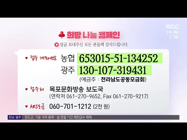 ◀ANC▶ 오늘의 간추린 뉴스입니다. 완도군은 단체 관광객 유치 여행사에 인센티브 지원을 확대합니다. 완도군은 20명 이상 단체 관광객을 유치하는 여행사에게 1인당 만 2천원에서 만 5천원씩의 인센티브를 지원하고 수학여행과 학생단체관광객은 30명 이상일 경우 완도읍은 1인당 6천원, 섬지역은 1인당 8천원을 지원합...