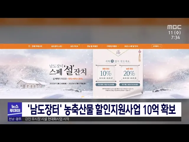 '남도장터'가 농식품부와 농수산유통공사가 추진하는 2023년 농축산물 할인지원사업에 선정돼 사업비 10억원을 지원받습니다. 소비자는 할인품목 구입 시 20% 할인, 최대 2만 원의 혜택을 받게 됩니다. 한편 남도장터는 설을 전후해 오는 27일까지 농수축산물을 최대 40% 할인하는 남도장터, 스페 ‘설’ 잔치 기획전을 추진...