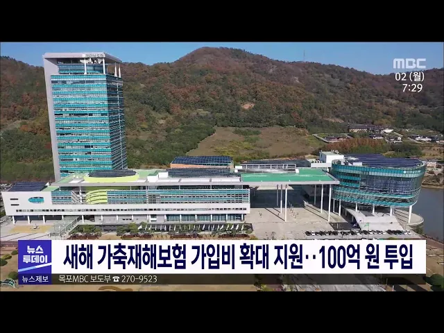 새해를 맞아 전남도가 가축재해보험 가입비를 지난해보다 20억원 늘어난 백억원을 선착순 지원합니다. 전남도내 축산농가에 지원되는 가축재해보험 가입비는 희망 농가당 4백만원 수준에서 보험가입비의 80%를 지원하고, 지원대상은 소, 돼지, 말, 가금류 등 16개 축종입니다. 가축재해보험에 가입하면 축종별 가입금액 한...