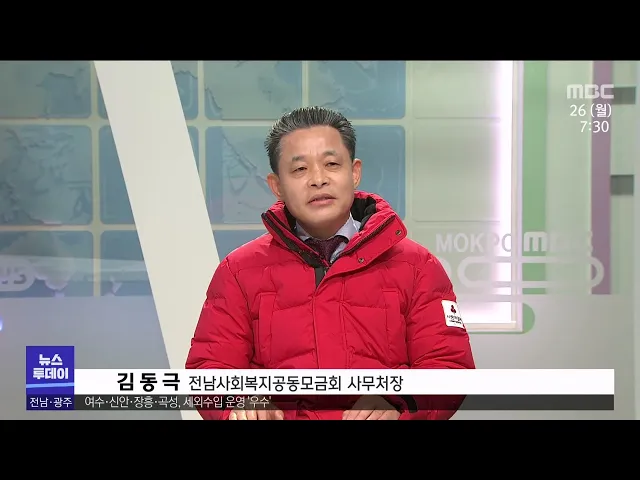 ◀ANC▶ 매년 연말이면 볼 수 있는 사랑의 열매, 나와 가족을 사랑하는 마음으로 이웃에게 사랑을 전하자는 나눔의 의미를 담고 있는데요. 전남사회복지공동모금회 김동극 사무처장과 이야기 나눠보겠습니다. ◀END▶ ◀VCR▶ 1. 먼저 시청자분들께 전남사회복지공동모금회를 간단히 소개해주시죠 전남사회복지공동모금...