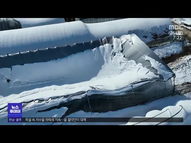 ◀ANC▶ 역대급 폭설이 쏟아진 광주전남지역에서 본격적인 복구가 시작되지 못 한채 피해 규모가 갈수록 커지고 있습니다. 워낙 많은 양의 눈이 쌓이다보니 치우기 쉽지 않은데다 기온도 영하권에 머물러 농촌마을의 복구작업이 더디게 진행되는 상황입니다. 이다현 기자가 취재했습니다. ◀VCR▶ 36cm 높이까지 눈이 쌓...