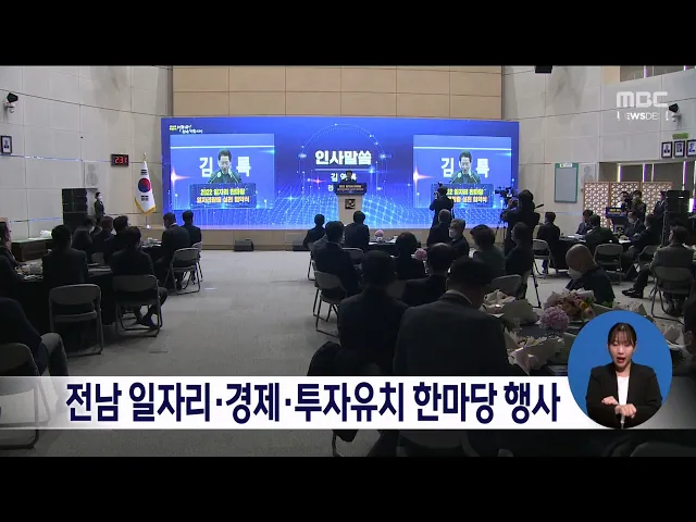 전라남도 일자리 경제 투자유치 한마당 행사가 전남도청 왕인실에서 개최돼 올 한 해 성과를 나눴습니다. 전라남도는 이 자리에서 도민 행복 으뜸 일자리 40만 개 창출을 위한 4대 전략 10대 추진 과제를 발표했으며 도와 시군이 일자리 종합계획 수립과 목표 달성을 위한 상호 실천 협약을 했습니다. 시군 평가에서는 일...