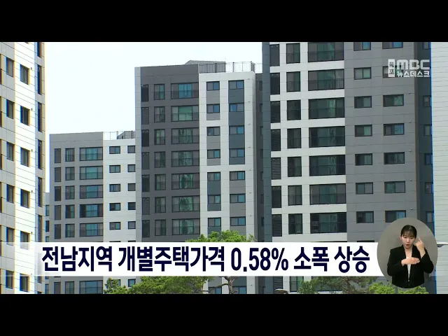 전남지역 2024년 개별주택가격이 전년보다 소폭 오른 것으로 나타났습니다올해 전남 개별주택가격은 지난해보다 평균 0.58% 올랐으며, 시군별로는 함평군 1.44%, 고흥군 1.14%, 화순군 0.85% 순으로 상승률을 보였습니다.개별주택공시가격은 22개 시군 누리집과 부동산공시가격알리미에서 열람할 수 있습니다.