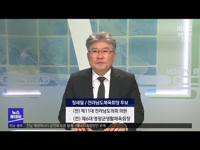◀ANC▶ 제38대 전라남도체육회장 선거가 오는 15일 실시됩니다. 3명이 출마를 했는데요. 오늘은 장세일 전남체육회장 후보와 이야기 나눠보도록 하겠습니다. ◀END▶ ◀VCR▶ 1. 안녕하십니까. 먼저 시청자분들께 인사와 소개 한 말씀 부탁드립니다. 존경하는 전남도민 여러분 반갑습니다. 민선2기 제38대 전남체육회장...
