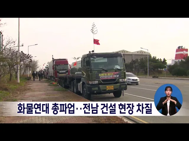 화물연대 파업이 장기화 조짐을 보인 가운데 전남지역 건설현장에서 일부 공사 차질이 빚어지고 있습니다. 전라남도에 따르면 도내 195곳 공사 현장 가운데 18곳에서 레미콘과 철근 등 공급 차질이 빚어졌으며 시멘트 출하는 파업 이전의 75%, 레미콘은 34개 사가 납품을 못하고 있습니다. 한편 도내 항만물류와 철강, 석...
