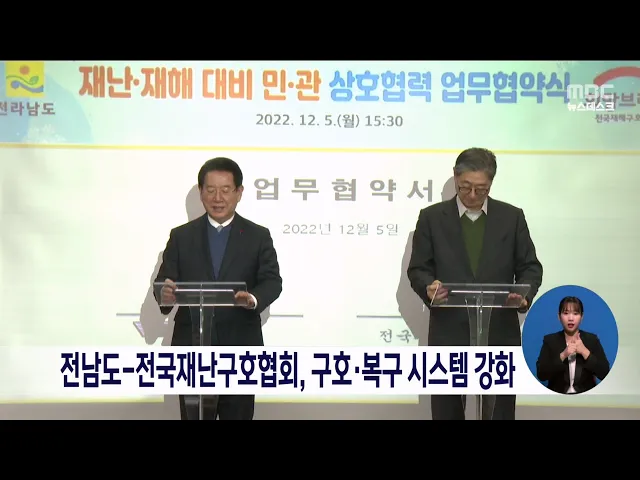전라남도는 전국재난구호협회와 재난,재해에 따른 도민 피해를 최소화하기 위해 구호*복구시스템 강화 업무협약을 체결했습니다. 이번 협약에 따라 두 기관은 재난재해 이재민 성금 모금과 자원봉사 지원, 취약계층 주거개선 사업, 재난재해 전문인력 양성 등 재해 예방과 피해 최소화를 위한 사업을 함께 추진합니다.