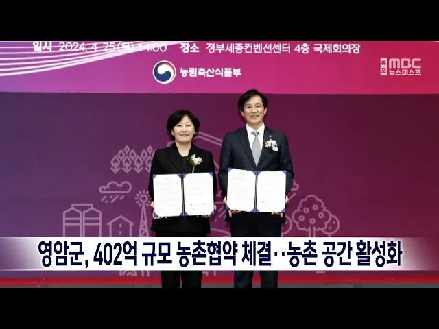 영암군이 농림축산식품부와총사업비 402억 규모의 농촌협약을 체결하고지역 농촌 공간을 활성화하기로 했습니다.영암군은 이에 따라 오는 2028년까지5년 동안 지자체에서 수립한 문화, 체육 프로그램과 농촌지역 생활 서비스 기능 강화 등농촌 공간 활성화 방안을 마련해시행할 계획입니다.
