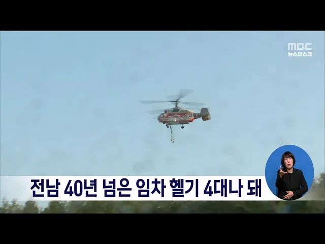 강원도 양양에서 노후 임차 산불 예방 헬기 추락사고로 5명이 사망한 가운데 전남에서 운용 중인 임차헬기도 노후기종인 것으로 알려졌습니다. 전라남도는 22개 시·군을 8개 권역으로 나눠, 민간 헬기업체 4곳에서 진화 헬기 8대를 임차해 운용중인데 모두 20년이 넘었고 40년 이상된 헬기도 4대에 달했습니다. 헬기는 내구...