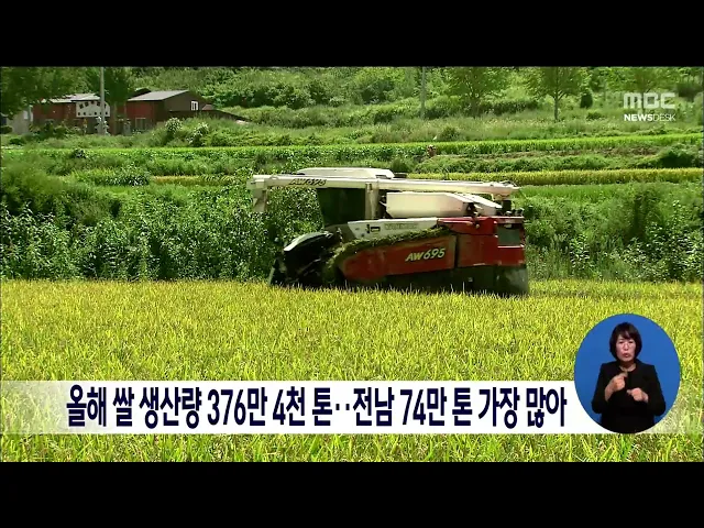 올해 전국 쌀 생산량은 376만 4천톤으로 지난해보다 3% 감소했지만, 전체적인 쌀 초과생산량은 15만 5천톤 정도가 될 전망입니다. 이처럼 쌀 생산량이 감소한 것은 지난해보다 벼 재배면적이 5천ha 줄었고, 기상 여건 등으로 단위면적 당 생산량이 감소했기 때문으로 풀이됩니다. 시도별 생산량은 전남이 74만 3천톤으로 ...