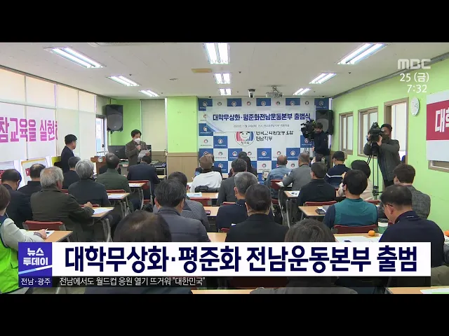 전교조 전남지부와 전남교육회의 등으로 구성된 대학무상화·평준화 전남운동본부가 출범식을 갖고 본격적인 활동을 시작했습니다. 전남운동본부는 학령인구 감소로 지방대가 소멸하면 지역 경제 붕괴로 이어진다며, 지역 거점대학 중심으로 협약을 체결해 지역연합대학으로 발전해야한다고 주장했습니다. 또, 대입자격고사 ...