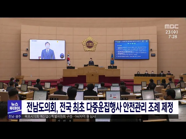 10.29 참사와 같은 재난을 막기 위해 다중이 모이는 각종 행사의 안전관리가 강화됩니다. 박문옥 전남도의원이 대표 발의한 '전남 다중 운집행사 안전관리 조례안'은 재난 발생 우려가 있는 3천 명 이상 다중운집행사에 대해 긴급 안전 점검을 실시하고 결과에 따라 시설 사용 제한과 행사 금지를 할 수 있도록 하고 있습...