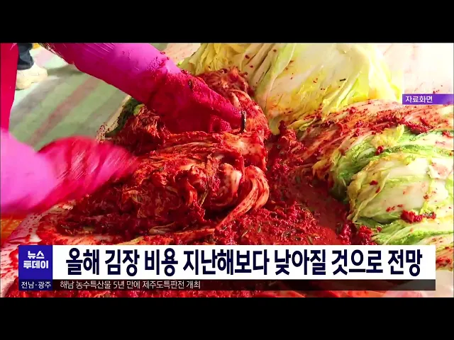 올해 김장비용은 작년보다 낮아질 것으로 전망됐습니다. 한국농수산식품유통공사가 전망한 배추 스무포기 기준 김장비용은 21만5천원으로 지난 주보다 2.9% 하락했고, 작년 11월 중순과 비교해도 12.2% 낮아졌습니다. 이는 배추와 무의 산지 출하량이 늘고, 고춧가루 등 김장재료 가격이 하락한 데 따른 겁니다.
