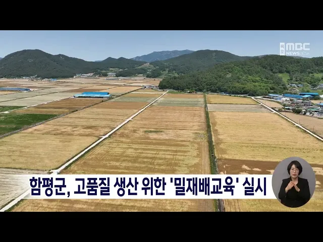함평군이 고품질 밭작물 생산을 위한 '밀재배교육'을 실시했습니다.함평군 농업기술센터는 밀 재배농가 50여 명을 대상으로 국산 밀의 품질 경쟁력 강화와 안정적인 생산기반을 구축하기 위해,단백질 향상 기술과 시기별 비료 사용법, 저장 기술 등 밀재배교육 강의를 진행했습니다.