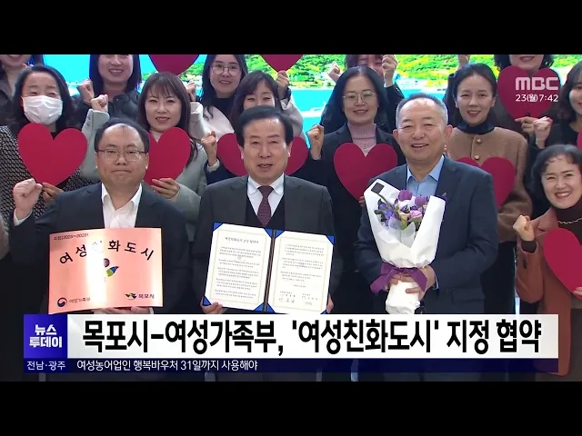 목포시가 여성가족부와 '여성친화도시' 신규 지정 협약을 체결했습니다.목포시는 여성친화도시 협약에 따라앞으로 5년간 국가와 지역발전을 위한 성평등 정책 사업 공동 발굴을 추진하고여성친화도시에 대한 국민적 관심과 공감대 형성을 위한 홍보와 교육을 추진할 예정입니다.