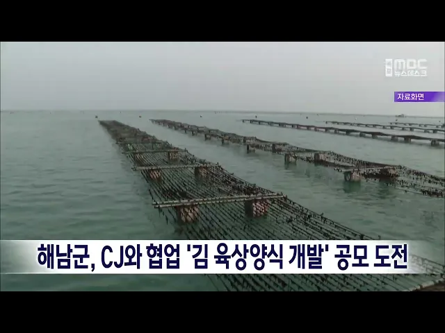 해남군이 전라남도와 CJ제일제당과 컨소시엄을 구성해 내년 공모 예정인 해양수산부의 '김 육상양식 개발사업'에 도전합니다.해남군은해상 김 양식량 급감에 대비해 오는 2029년까지 5년간 350억원을 투입하는 등김 육상양식 시스템 개발사업을 추진하고 있는 해수부 방침에 따라,CJ 등 기업과 협업으로 내년도 공모사업과 ...