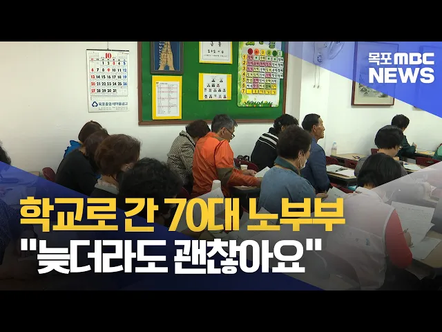 ◀ 앵 커 ▶'배움에는 나이가 없다'라는 속담처럼늦은 나이에도 새로운 도전을 이뤄나가는 사람들이 있습니다.젊은 시절, 배우지 못했다는 한과 아쉬움으로늦깎이 공부를 시작한 70대 노부부를안준호 기자가 만나봤습니다.◀ 리포트 ▶뽀글머리를 한 어르신들이 교실 안을 가득 메웠습니다.학생들의 평균 나이 60세 이상, 학력...