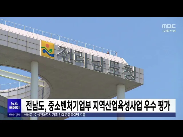 전라남도가 중소벤처기업부의 ‘2024 지역산업육성사업’ 성과평가에서 우수기관으로 선정됐습니다.지역산업육성사업은 중기부와 지자체가 지역산업진흥을 목표로지역 특화 중소기업을 지원하는 사업으로,전라남도는 작년 한 해 성장사다리 지원과 시군 연고사업 등 분야에서 우수한 실적을 인정받았습니다.