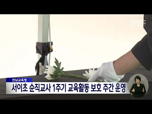 전라남도교육청이서이초등학교 교사 순직 1주기를 맞아 ‘교육활동 보호 주간’을 운영하기로 하고도교육청 본관 앞에 추모 공간을 마련했습니다.오늘(15)부터 나흘 간의 ‘교육활동 보호 주간’에는각 학교와 교육지원청에서 묵념과 헌화, 현수막 게시 등을 진행하고해당 기관 및 학교별 자체 행사를 통해 교육활동 보호 의지...