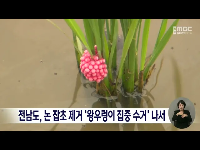 전라남도가 벼 생육 초기에 논 잡초 제거에 사용된 왕우렁이들의 집중 수거에 나섰습니다.이번 집중 수거는되풀이되는 왕우렁이 피해를 방지하기 위해 잡초 제거를 완료한 왕우렁이가 논 밖으로 유출되는 것을 막기 위한 것으로,7월 한 달간 농경지와 배수로 주변의 우렁이알과 왕우렁이가 집중 수거될예정입니다.