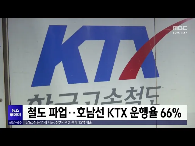 전국철도노동조합의 파업이 7일째에접어들면서 호남선 KTX 운행율이평소 대비 66%수준을 보이고 있습니다.한국철도공사는 호남선 KTX고속열차 운행이48회에서 32회로 줄었으며, 새마을호와 무궁화호 등 호남선 일반 여객 열차운행횟수는 45회에서 27회 수준이라고밝혔습니다.
