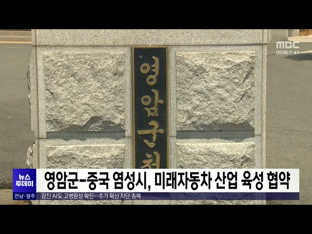 영암군이 중국 강소성 동북부에 있는첨단산업 특화지역인 염성시와 미래자동차 산업 육성 업무협약을 체결했습니다.협약을 통해 두 도시는미래자동차 분야 기술 협력과 산업 생태계 구축 강화, 지속가능한 경제 성장 도모 등에 공동으로 협력하기로 했습니다.