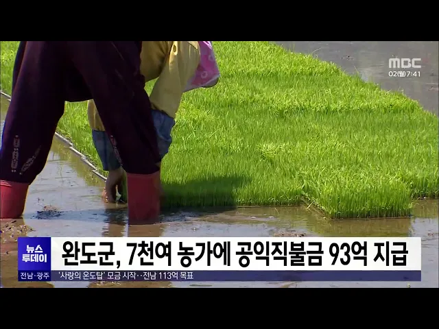 완도군이 2024년 기본형 공익 직불금을 12월 2일부터 순차적으로 지급합니다.이번 공익직불금 가운데 소농 직불금은 4천 721 농가에 61억 원,농지 면적에 따라 지급하는 면적 직불금은 2천 86 농가에 32억 원이 확정됐습니다.올해 소농 직불금은 농가당 지급 단가가 120만 원에서 130만 원으로 인상됐습니다.