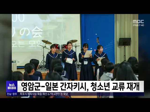 영암군과 일본 간자키시 자매학교들이청소년 교류를 재개했습니다.29명의 학생들과 8명의 인솔자로 구성된간자키시 자매학교 방문단은 어제(27)낭주중학교와 삼호서중학교 등에서 한국의 교육을 체험하고 한복입기와 미술 수업 등을 함께 했습니다.영암군은 실무협의를 거친 뒤 내년 봄왕인문화축제기간 정식 우호교류협약...