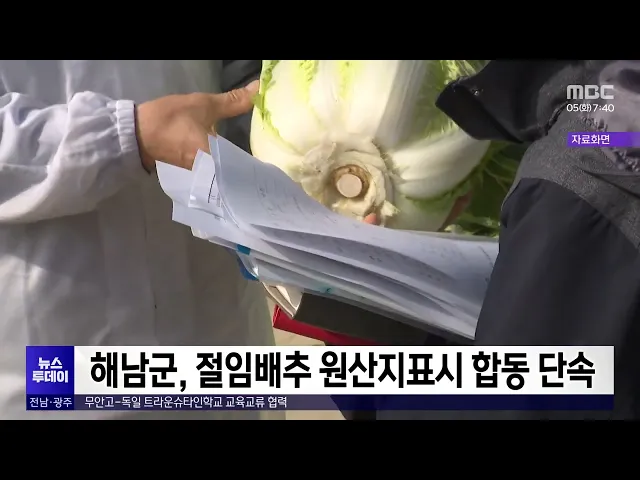 해남군이 김장철을 맞아 이달 말까지지역 절임배추 생산시설을 대상으로원산지 표시 단속에 나섭니다.국립농산물품질관리원 등과합동으로 실시하는 이번 단속에서는 타 지역 배추를 해남산으로 거짓 표시하거나 외국산 소금을 국내산으로 거짓표시하는 등의원산지 표시와 표시방법 적정 여부를집중적으로 살필 예정입니다.