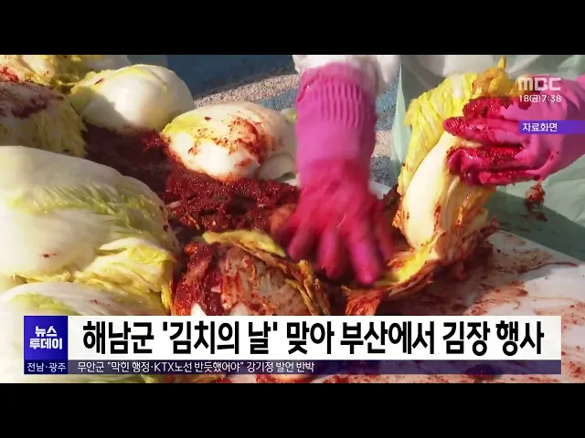 해남군이 오는 25일부터 27일까지김치의 날을 맞아 부산에서김장 행사를 추진합니다.이번 행사에서는 부산 해운대구 구남로 일원에서절임배추 사전 예약과 김치만들기 체험,지역특산물 판매와 강강술래 공연,김장 일주일 늦추기 캠페인 등이 이어집니다.