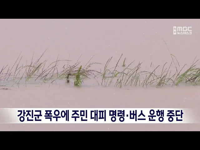 강진군에도246밀리미터의 많은 비가 내린 가운데금강천 하천 수위가 상승해주민 대피 명령이 내려졌습니다.강진군은 짧은 시간에 많은 비가 내려하천 수위가 상승하고 곳곳에서 물이 범람하고 있다며 병영면과 작천면 등 일대 주민들에게 인근 마을회관 등으로대피할 것을 안내했습니다.이와 함께 강진군과 장흥군은집중호...