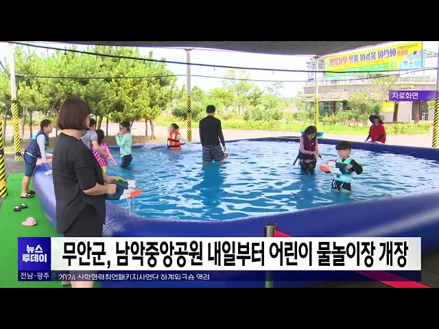 무안군이 오는 3일부터 18일까지남악중앙공원에서 임시 어린이 물놀이장을무료로 운영합니다.어린이 물놀이장은 대형 슬라이드 2개와풀장 3개를 갖춘 수영장으로 구성돼 있고그늘막 등 편의시설을 갖췄습니다.운영시간은 평일 오전 11시부터 오후 5시,주말은 오전 10시부터 오후 5시까지이며만 3세부터 초등학생까지 이용가...
