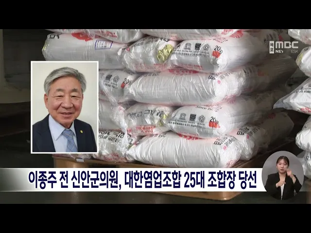 대한염업조합 제25대 조합장에 이종주 전 신안군의원이 당선됐습니다.이 당선인은 오는 4월 1일 정식 취임하며, 천일염의 세계적 브랜드화를 목표로 가격 안정과 품질 향상에 힘쓰겠다고 밝혔습니다.또한 새 청사와 대형 저장시설 건립도 추진할 계획입니다.한편, 대한염업조합은 1967년 설립된 해양수산부 산하 특수법인으...