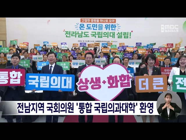 전남지역 국회의원들이 전라남도의 '통합 국립의과대학' 추진을 환영하고 나섰습니다.국회의원들은 오늘 환영문을 통해목포대와 순천대가 지난 15일 대학통합과 함께 통합 국립의과대학 설립을 추진하기로 합의한데 환영한다며 2026년 통합 국립의과대학 개교와 동서부 양지역 대학병원 설립에 전폭적인 지원을 하겠다고 밝...