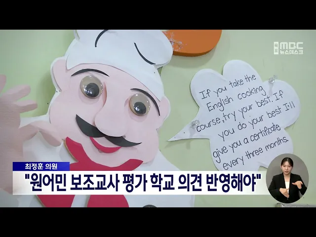 외국인 원어민 교사에 대한 평가가 허술하고현장의 의견이 충분하게 반영되지 않고 있다는 지적이 나오고 있습니다.전남도의회 최정훈 의원은전남도국제교육원 행정사무감사에서 5점 척도의 외국인 원어민 보조교사만족도 조사는 평가의 기능이 거의 없어 학교 현장의 목소리가 정확하게 반영될 필요가 있다고 주장했습니다...