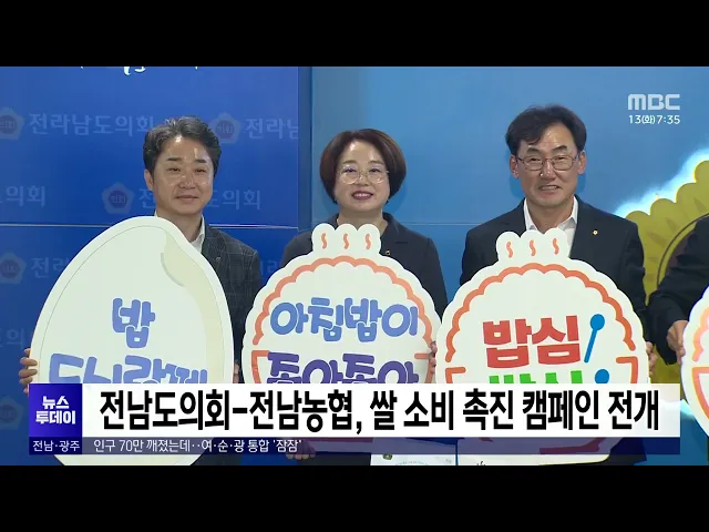 전라남도의회는 오늘(12일)전남농협과 함께 쌀 소비 촉진을 위한 릴레이 캠페인을 전개했습니다.이번 캠페인은 쌀 소비량 감소와 쌀값 하락에 대응하기 위해 '도민 아침밥먹기''쌀 가공식품으로 구성한아침 간편식 지원 사업' 등을 홍보하기 위해 마련됐습니다.한편, 지난해 기준 국내 1인당 연간 쌀 소비량은 56.4kg으로이...