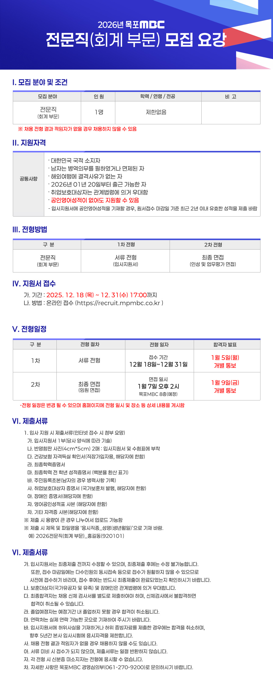 공지사항 목포MBC 2026 전문직(회계 부문) 모집 게시기간 : 2025-12-18 09:00부터 2025-12-31 17:00까지 등록일 : 2025-12-18 09:00 목포MBC관리자 조회수 : 38 이전글 목록