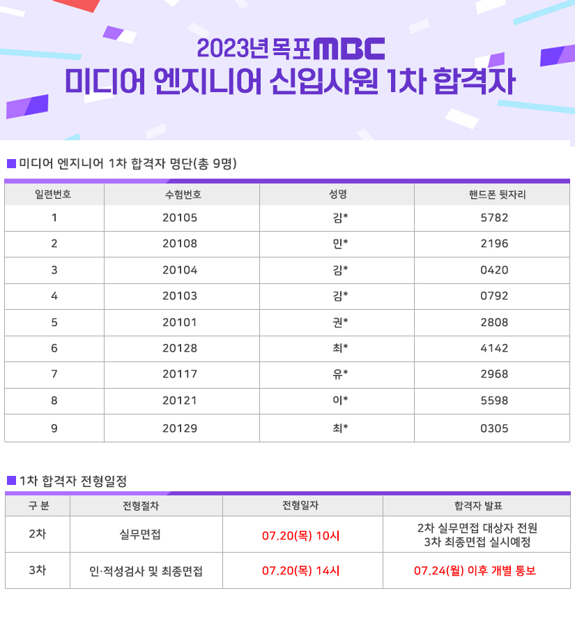 2023 목포MBC 미디어 엔지니어 신입사원 1차 합격자