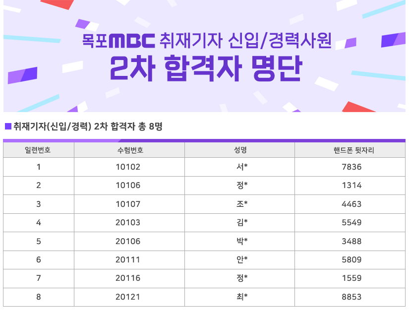 공지사항 2023년 목포MBC 신입/경력 사원(취재기자) 2차 합격자 발표 등록일 : 2023-02-21 17:13 admi****@m****.kr 조회수 : 1719 이전글 다음글 목록