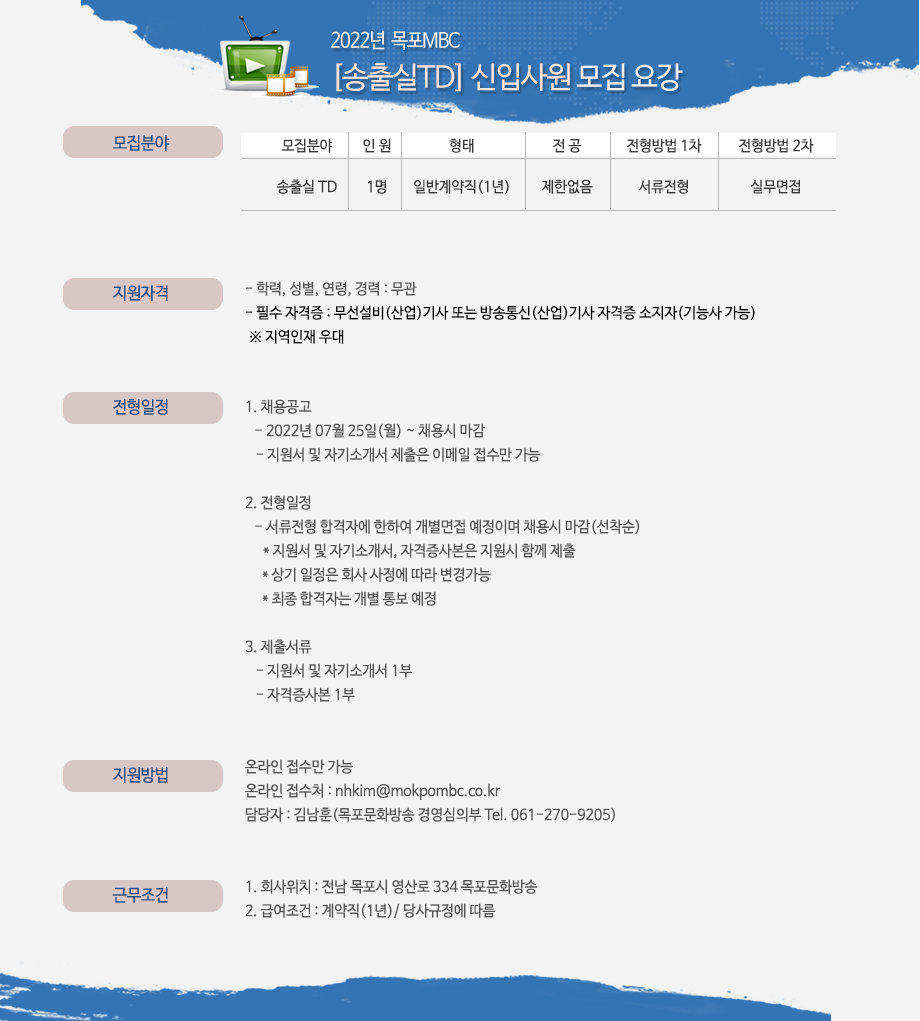 2022년 목포MBC [송출실TD] 신입사원 모집