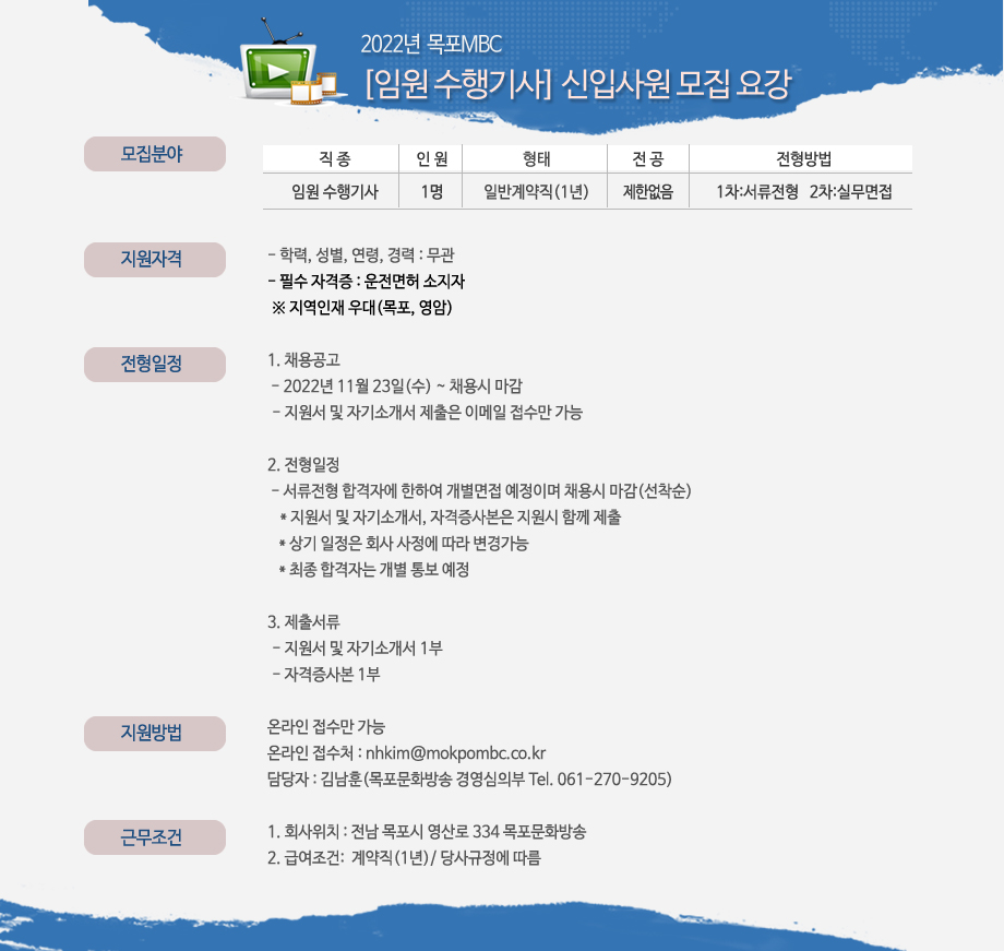 2022 목포MBC [임원 수행기사] 신입사원 모집 요강