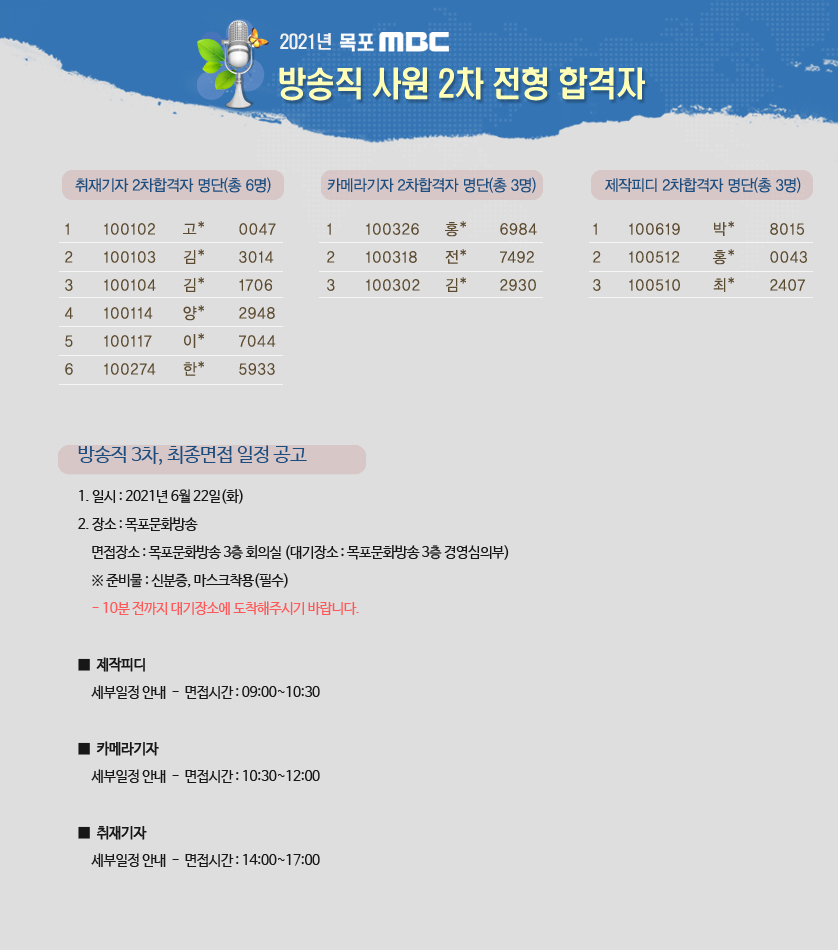 공지사항 2021년 목포MBC 방송직 2차 전형 합격자 발표 및 3차, 최종면접 일정 공고 등록일 : 2021-06-11 17:01 admi****@m****.kr 조회수 : 1941 이전글 다음글 목록