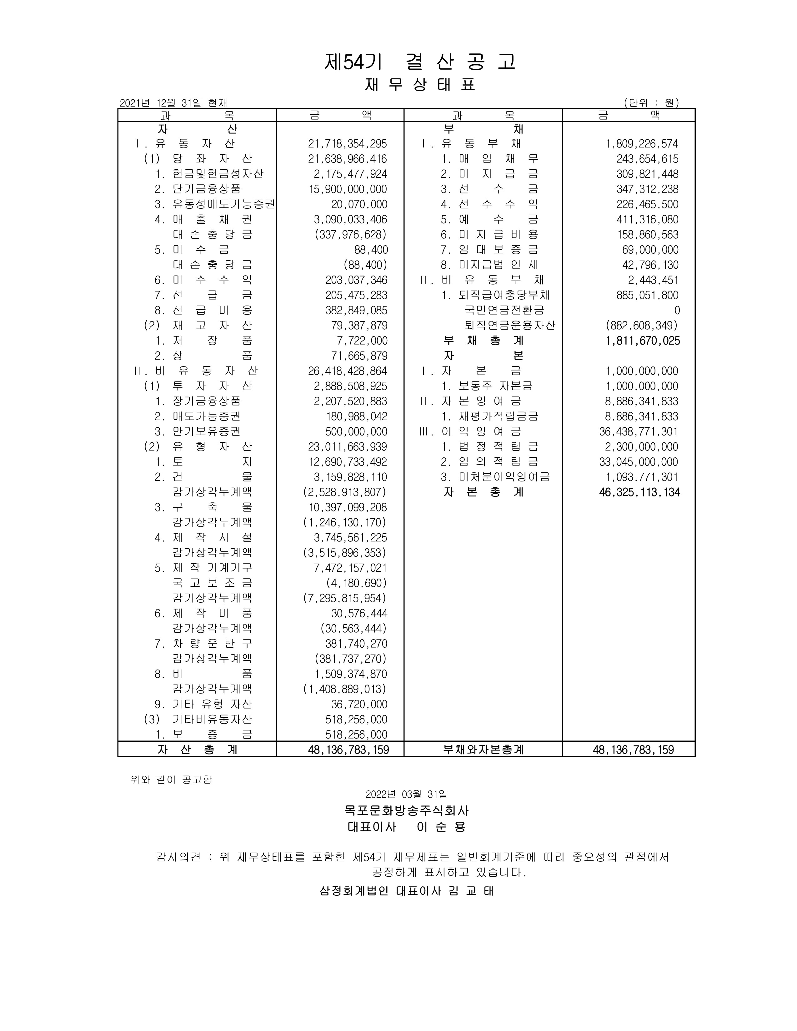 목포MBC 제54기 결산공고