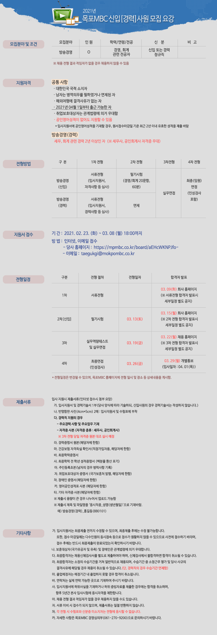 공지사항 2021 목포MBC 방송경영 신입[경력] 사원 모집 등록일 : 2021-02-22 14:49 admi****@m****.kr 조회수 : 2122 첨부파일 tLYPACYGbm3--목포MBC입사지원서.hwp (32.00 KB) 다운로드 이전글 다음글 목록