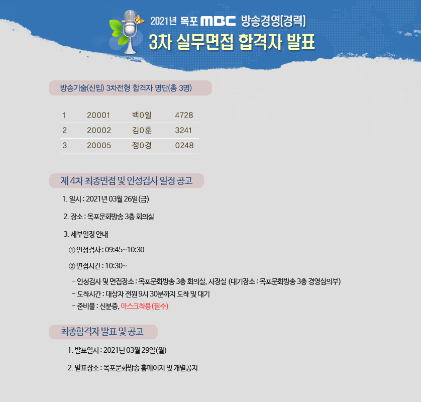 공지사항 2021 목포MBC 방송경영(경력) 3차 실무면접 합격자 발표 등록일 : 2021-03-22 11:05 admi****@m****.kr 조회수 : 1229 이전글 다음글 목록