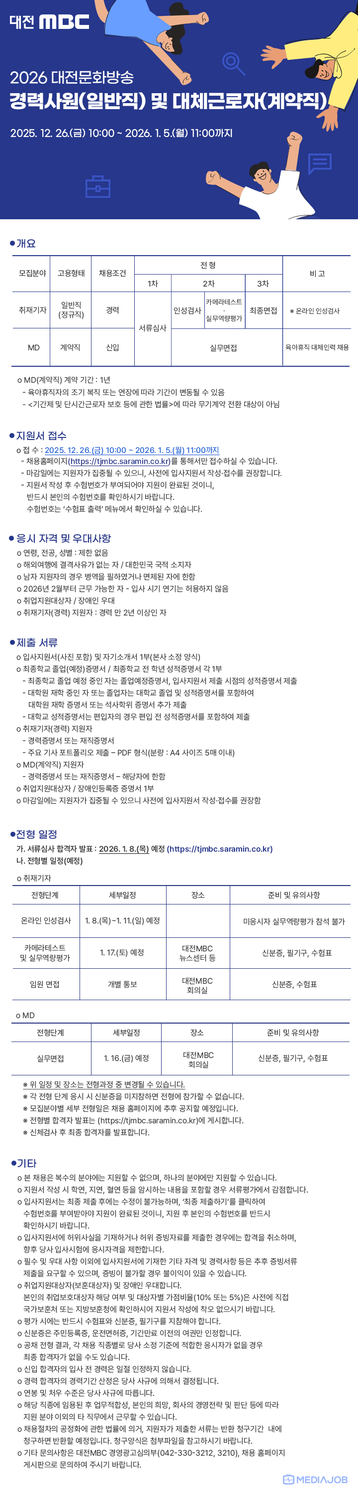 2026 대전문화방송 경력사원(일반직) 및 대체근로(계약직) 모집