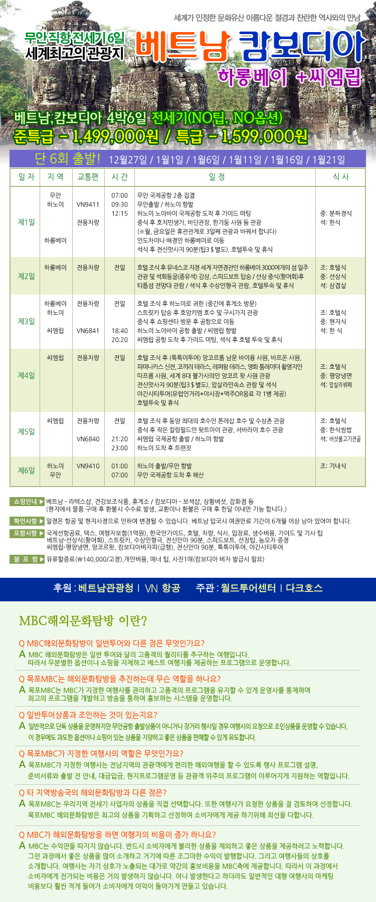 해외문화탐방 세계최고의 관광지 베트남 캄보디아 하롱베이+씨엠립 장소 베트남 캄보디아 하롱베이+씨엠립 일정 2013.12.27~2014.01.21 목록으로 세계가 인정한 문화유산 아름다운 절경과 찬란한 역사와의 만남 무안 직항 전세기 6일 세계최고의 관광지 베트남 캄보디아 하롱베이+씨엠립 단 6회 출발! 12월27일 / 1월1일 / 1월6일 / 1월11일 / 1월16일 / 1월21일 베트남,캄보디아 4박6일 전세기(NO팁, NO옵션) 준특급 - 1,499,000원 / 특급 - 1.599,000원