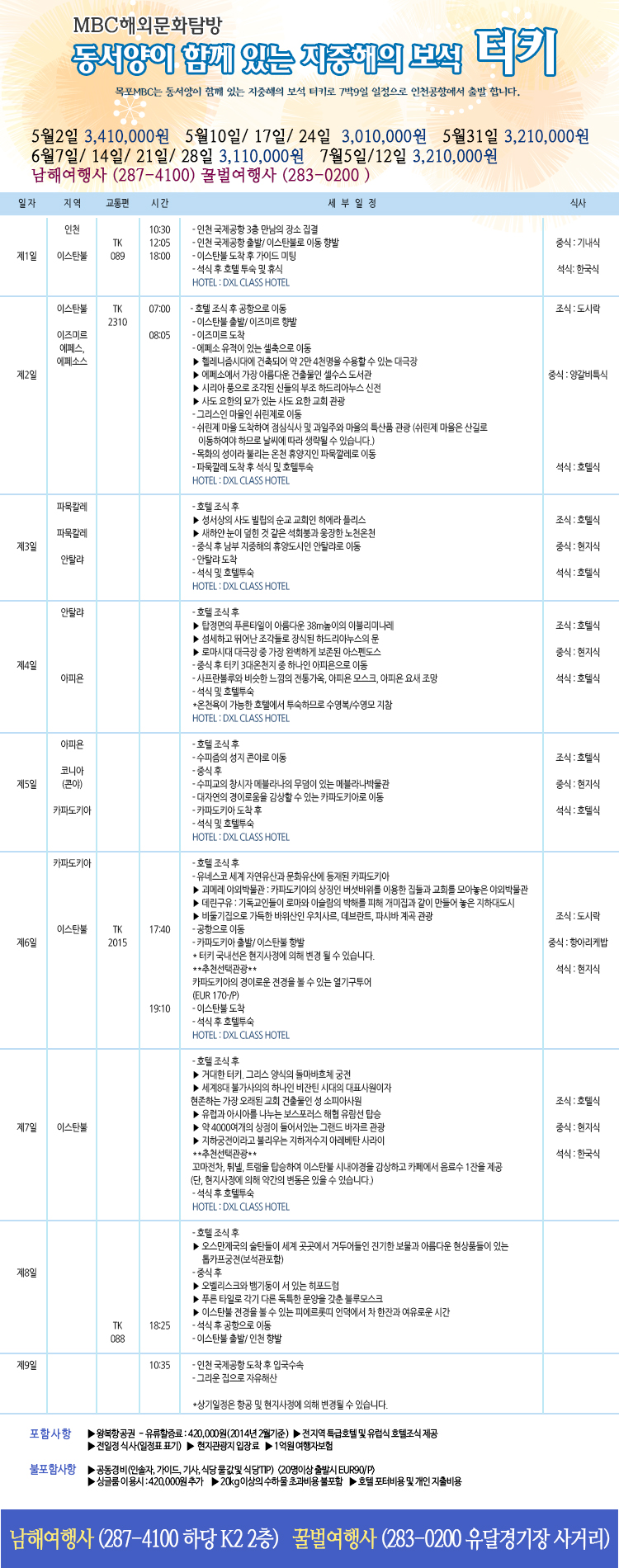* 터키7박8일 (5월 2일, 10일, 17일, 24일, 31일 / 6월 7일, 14일, 21일, 28일 / 7월 5일, 12일)