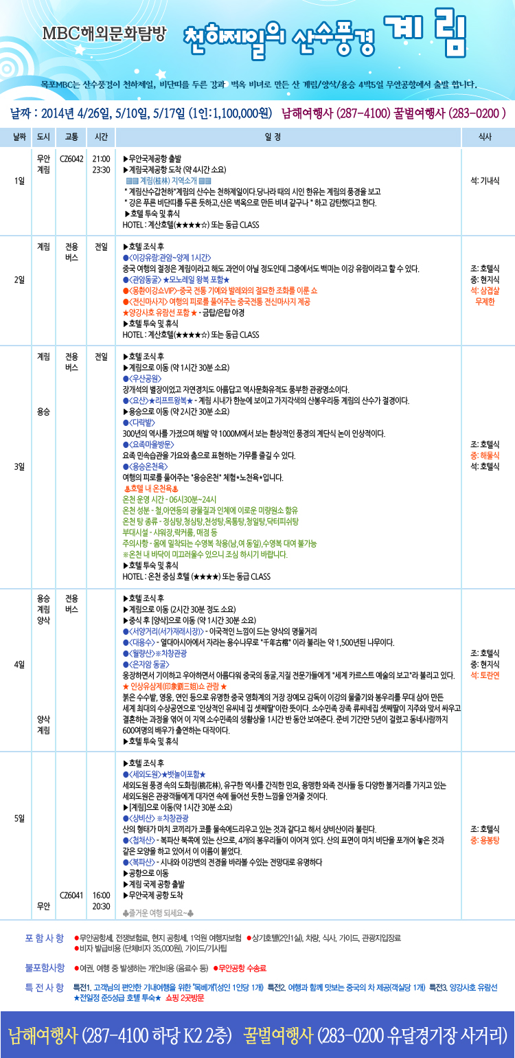 * 계림 4일/5일 (4월26일, 5월7일,10일, 14일, 17일 출발)