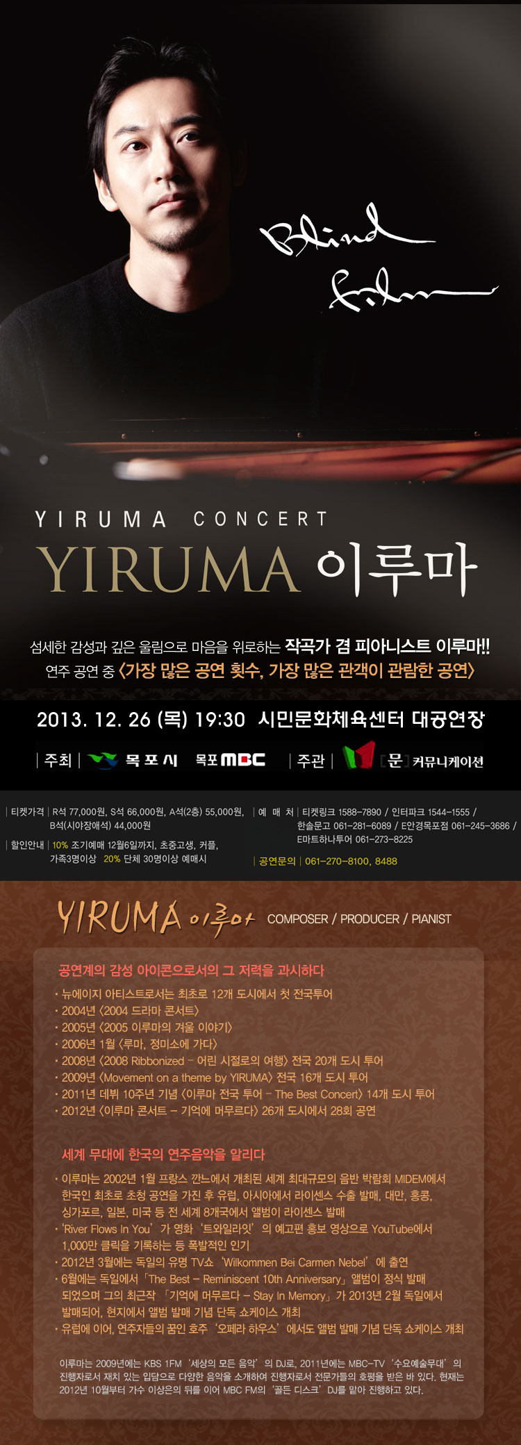 공연전시축제 이루마 콘서트 장소 일정 2013.12. 26 (목) 오후7시30분 목록으로 장소 : 시민문화체육센터 대공연장 일시 : 12월 26일 목요일 오후7시30분 (인터미션포함 2시간공연) 1회공연 판매금액 : 판매금액 R 77,000 S 66,000 A 55,000 B44,000 현대삼호단체할인 20% 일반판매처 : 한솔문고, E안경목포점, E마트내하나투어, 인터파크, 티켓링크